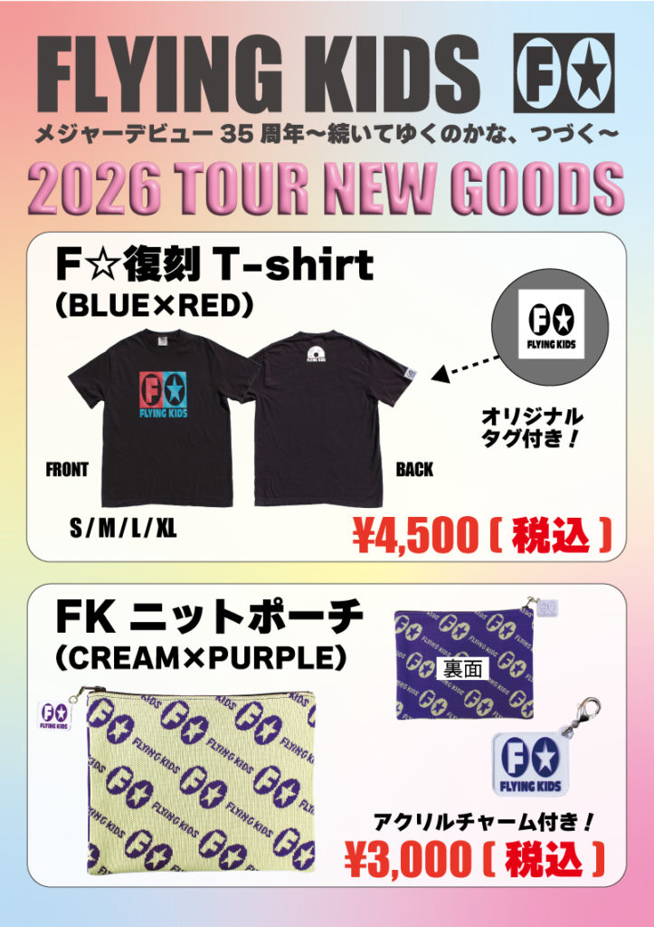 FLYING KIDS ☆ 新作 TOUR GOODS! 2026年4月2日 最終更新日時 : 2026年4月2日 hashimoto FLYING KIDS メジャーデビュー35周年ツアー~続いてゆくのかな、つづく~ 4月4日(土)Veats Shibuya公演より販売スタート☆(通販は現状未定です) .