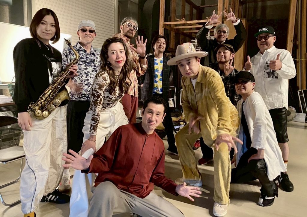 FLYING KIDSのメンバーの他に、俳優の渋川清彦さん、ROGUEの香川誠さんも一緒に写っています。